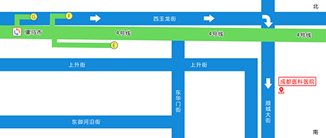 从骡马市地铁口G口向正东方向出发,沿西玉龙街走450米,过人行道,到路口斜对面,右转进入顺城大街辅路右转进入顺城大街辅路,沿顺城大街辅路走120米,即到成都医科医院