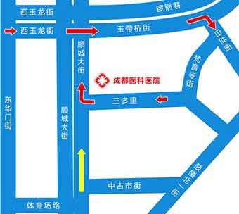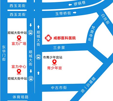 3、从市青少年宫前面的市青少年宫站出发,沿顺城大街向北方走120米即到成都医科医院。(途经公交:1路;52路;55路;61路;64路;98路;341路;夜间专线298路 )